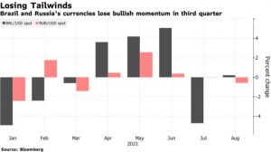 The Brazilian real and the Russian ruble, which outpaced most of their peers in the first half amid policy tightening, have now gone into reverse. The real has slumped about 4.5% since the end of June, more than any other major currency tracked by Bloomberg.