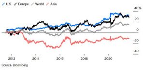 Since 2011, U.S. government debt returned 32% to investors, beating the 26% from European Treasuries, World Treasury’s 13% and Asia Treasury’s loss of 11%, according to Bloomberg bond indices. That’s another way of showing that the U.S. outperformed every competitor across the globe in the decade following the downgrade.