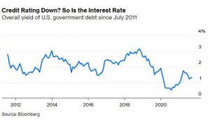 The most pronounced trend has been the unabated demand for Treasuries at lower yields. Back in 2011, between the news of a possible downgrade and the Aug. 5 decision, the cost of government borrowing fell as much as 55 basis points to 2.4%, then the lowest interest rate during the previous 10 months, according to data compiled by Bloomberg. The appetite for Treasuries brought the rate on the benchmark bond to a low of 0.5% on Aug. 4, 2020 and it changes hands today at 1.3%.