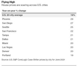 In Phoenix alone, an index that measures home prices climbed a whopping 29.3% in June from the previous year, as more people move to the city. The measure in San Diego rose 27.1%, while Seattle increased 25%. The index in nine cities jumped 20% or more.
