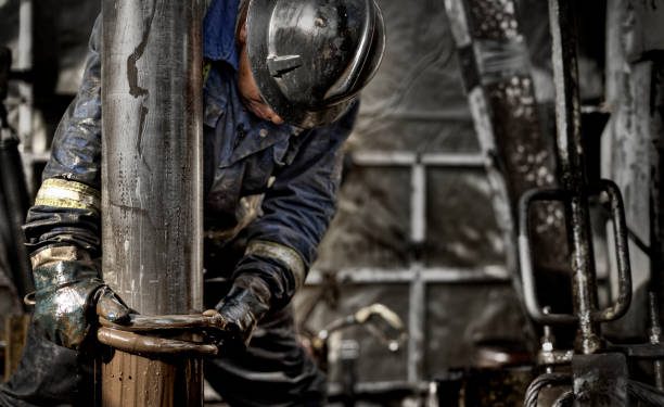 Oil Rig Worker wearing his safety gear working on the muddy drill floor